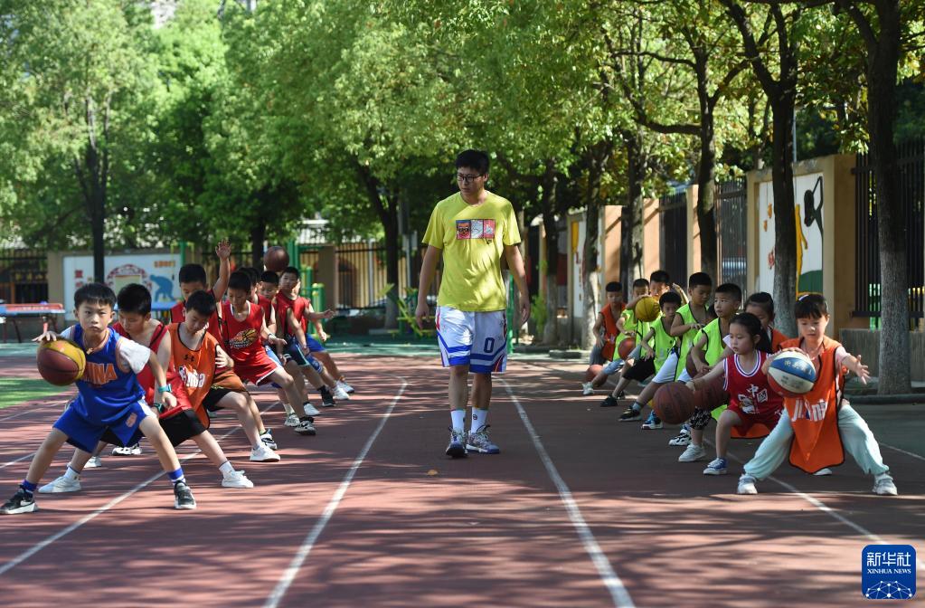 8月11日,在合肥市蜀新苑小學暑期托管班里,學生在老師指導下學習籃球。