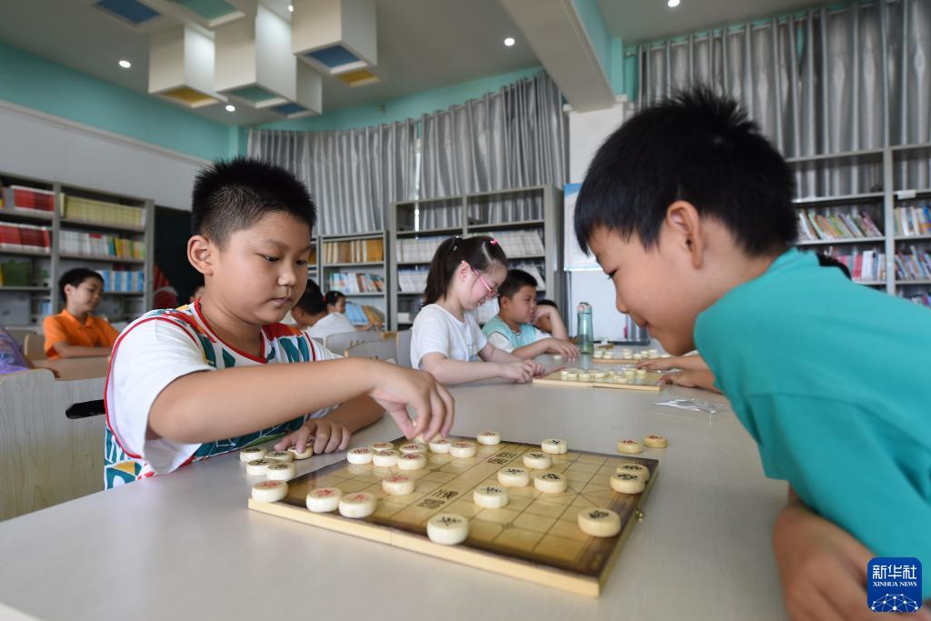 8月11日,合肥市蜀新苑小學的學生在暑期托管班里學習下象棋。