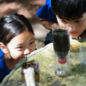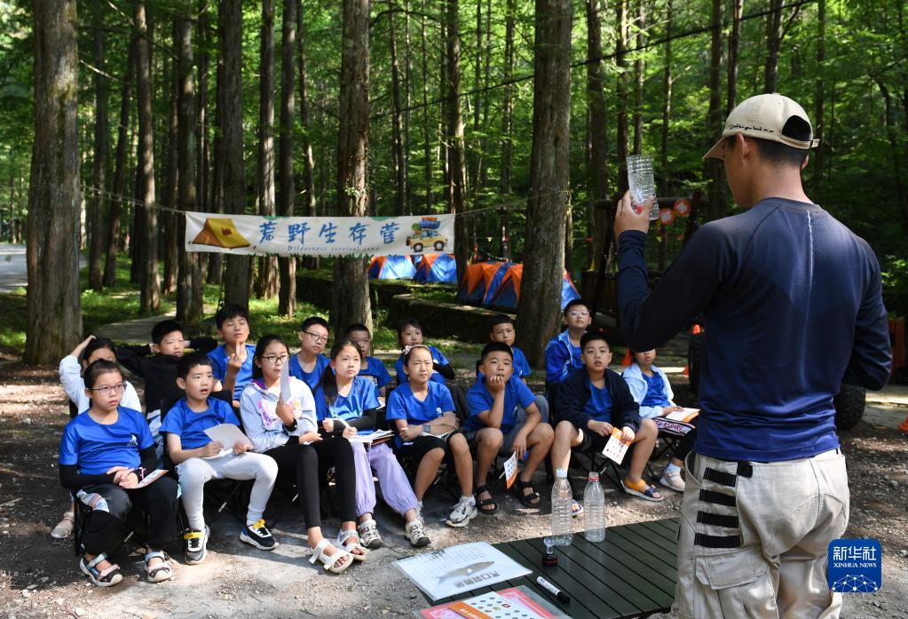 8月10日,在陜西漢中黎坪國家森林公園,研學(xué)團隊的老師為小朋友講解過濾凈水法。
