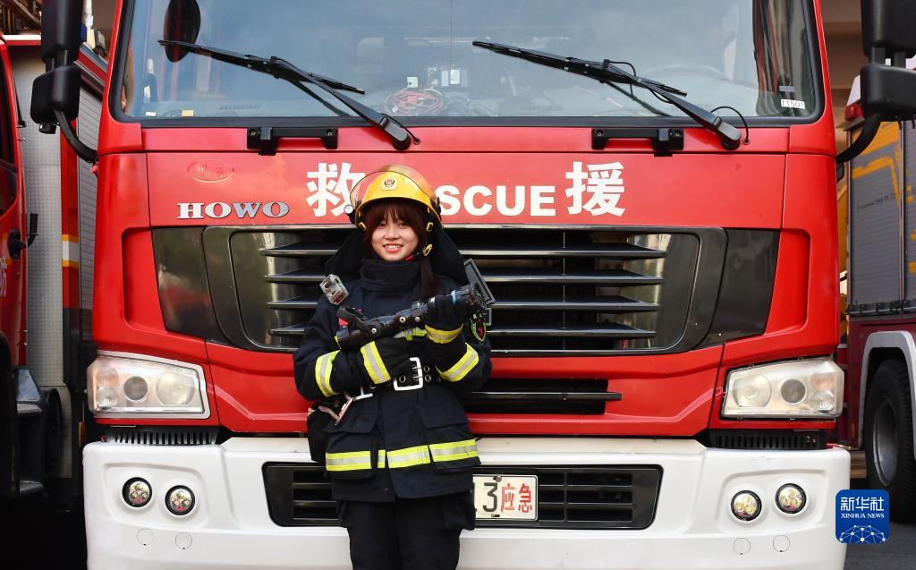 陶佳煜穿上消防服在萍鄉(xiāng)市消防救援支隊的消防車前留影(7月11日攝)。