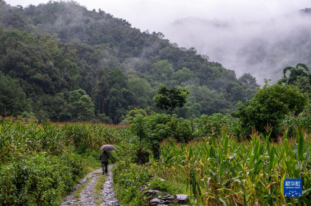 由于下雨,無法使用無人機(jī)監(jiān)測,遲遲沒有找到象群位置的刁發(fā)興徒步進(jìn)入山區(qū)尋找(8月1日攝)。新華社記者 江文耀 攝