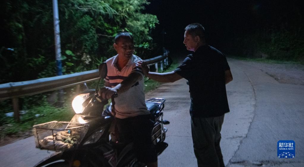 刁發興(右)提醒夜間出行的村民注意安全(7月31日攝)。新華社記者 江文耀 攝