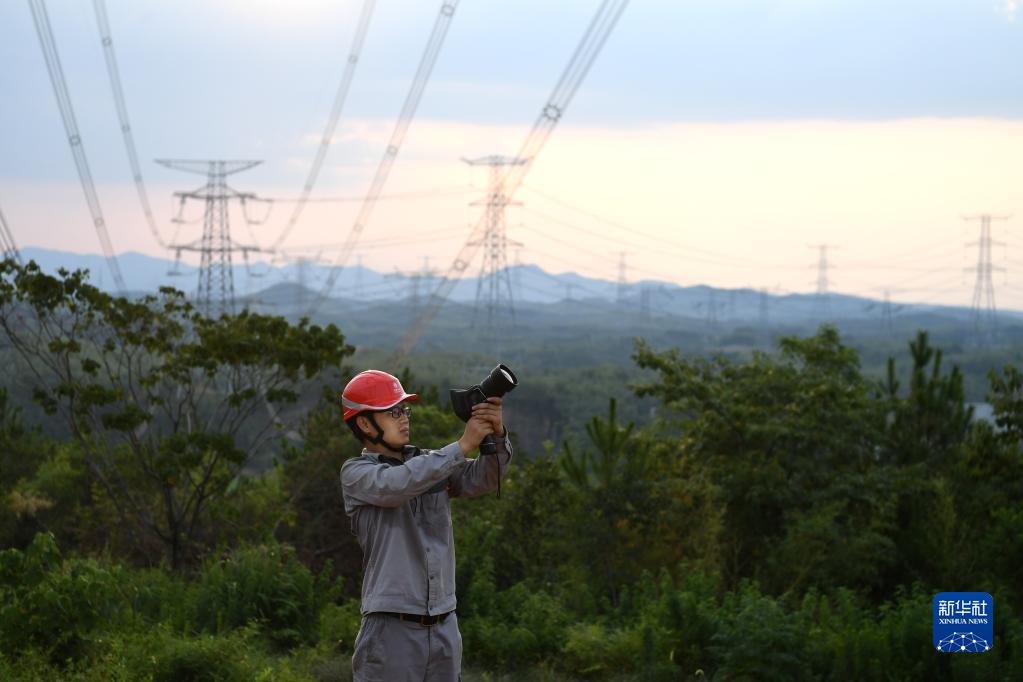 8月11日,安徽送變電工程有限公司廣德運檢站運維人員使用紅外測溫器觀測輸電設備溫度。