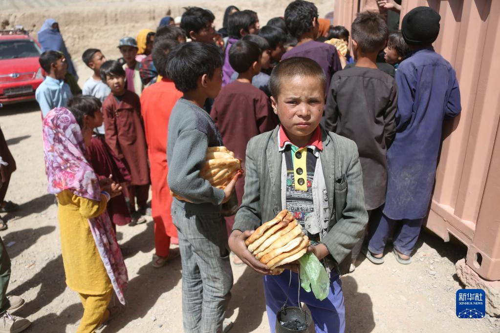 7月13日,阿富汗巴米揚兒童參加文物保護知識培訓后領到食物。