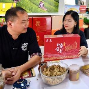 在福建省寧德市蕉城區(qū)金涵鄉(xiāng)上金貝村的直播間,上金貝村黨支部書記蘭春華(左)在與主播向網(wǎng)友推介家鄉(xiāng)特產(chǎn)(8月11日攝)。