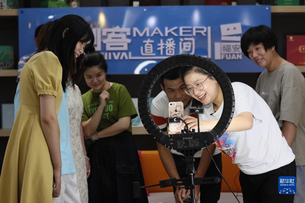 福建省福安市返鄉(xiāng)創(chuàng)業(yè)大學生林恩輝(右二)在創(chuàng)客直播間向當地青年傳授直播技巧(8月10日攝)。