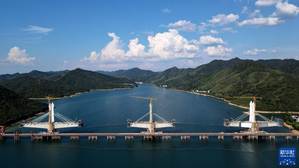 這是正在建設中的中國鐵建大橋局池黃鐵路太平湖特大橋(8月12日攝,無人機照片)。