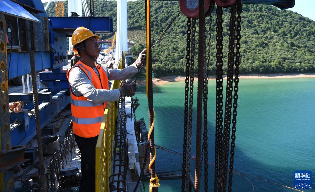 8月12日,工人在中國鐵建大橋局池黃鐵路太平湖特大橋建設(shè)工地施工。