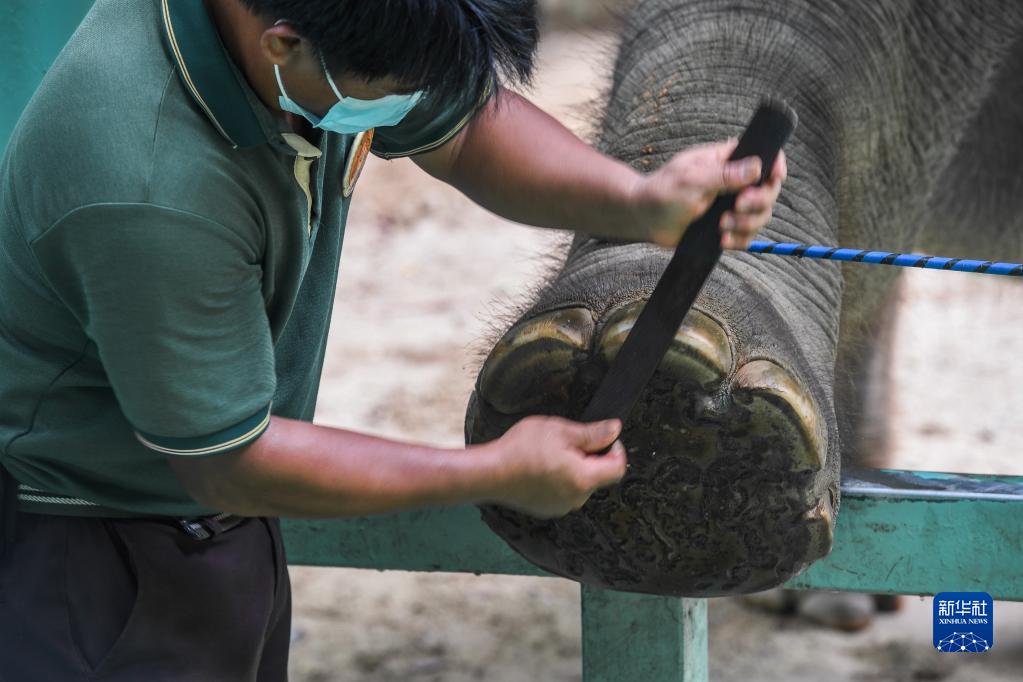 8月12日,廣州長隆野生動物飼養員為亞洲象修足。8月12日是第11個世界大象日。為進一步提高公眾野生動植物保護意識,廣州長隆野生動物世界舉辦大象主題趣味科普活動,呼吁人們關注大象種群的生存現狀與棲息地保護。新華社記者 劉大偉 攝