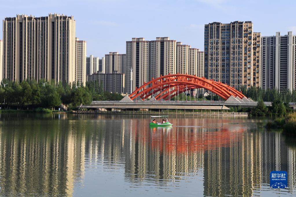 游客在蘭州新區棲霞湖上劃船游玩(8月9日攝)。