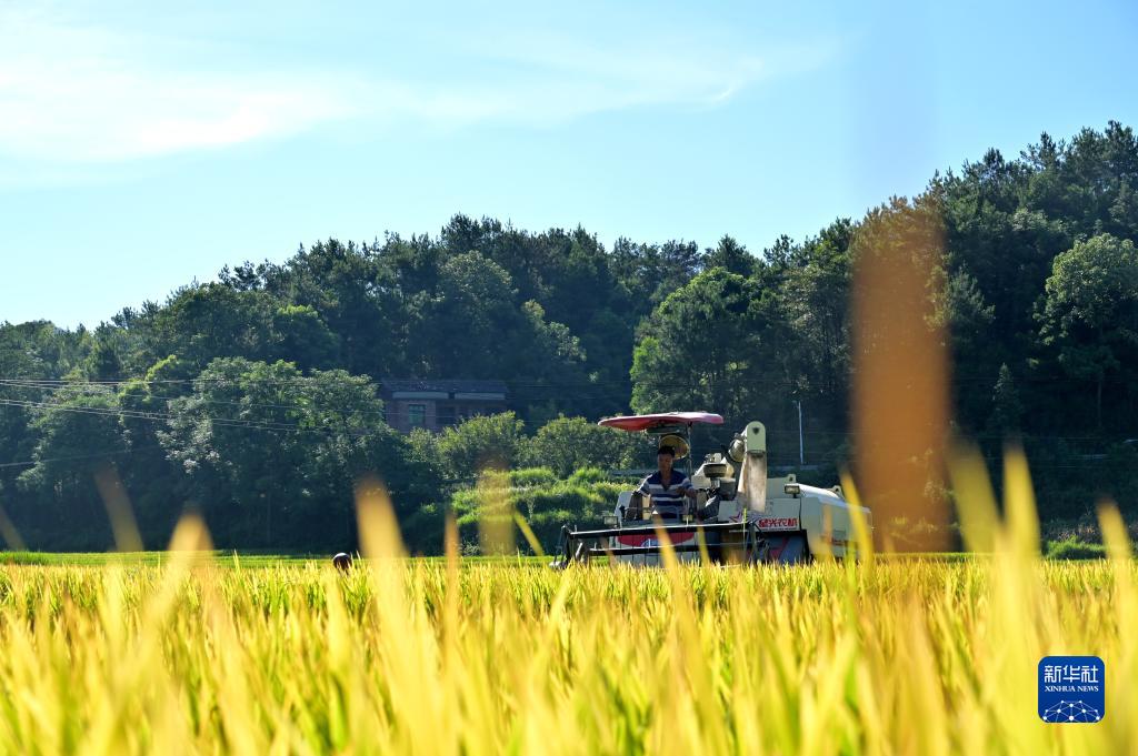 8月12日,在湖南省雙峰縣井字鎮銅梁村,農民駕駛收割機收割再生稻。