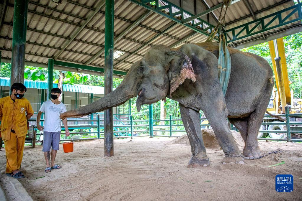 8月6日,在泰國南邦府“亞洲象之友”大象醫院,工作人員看望一頭受傷的大象。