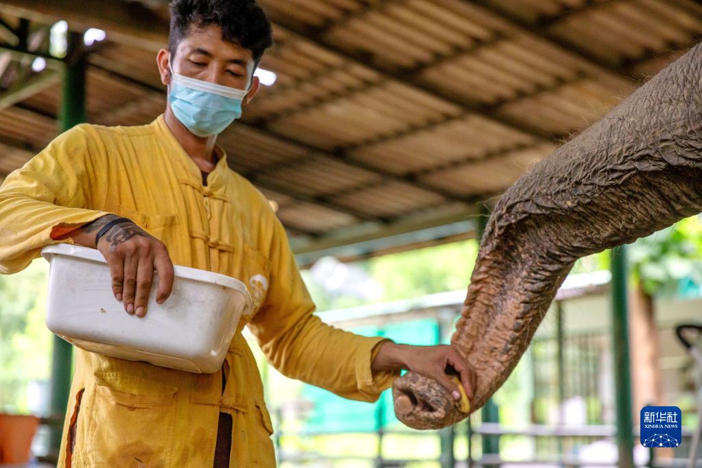 8月6日,在泰國南邦府“亞洲象之友”大象醫院,工作人員給一頭受傷的大象喂食。
