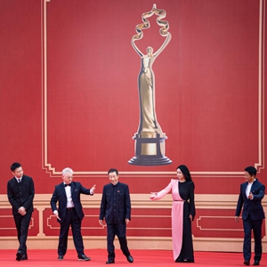 8月12日,本屆“天壇獎”國際評委會成員李雪?。ㄖ校?、郭帆(左一)、柯文思(左二)、秦海璐(右二)、吳京亮相開幕紅毯儀式。