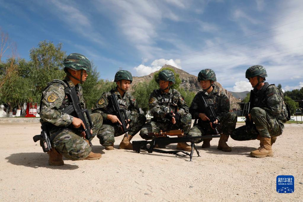 武警西藏總隊某中隊副小隊長楊友剛(中)進行狙擊教學(8月9日攝)。新華社發(李如輝 攝)