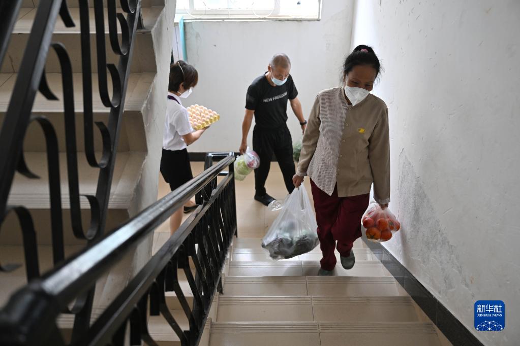 8月13日,三亞市一個小區(qū)的物業(yè)工作人員(左一、右一)幫居民將生活物資送往家中。