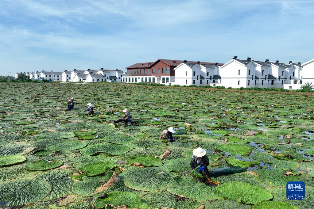 8月13日,在江蘇省淮安市洪澤區岔河鎮,農民在采收芡實(無人機照片)。