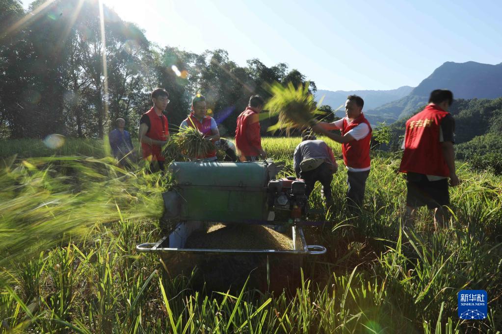 8月13日,貴州省赤水市寶源鄉的黨員志愿者在玉豐村幫助農戶收割水稻。
