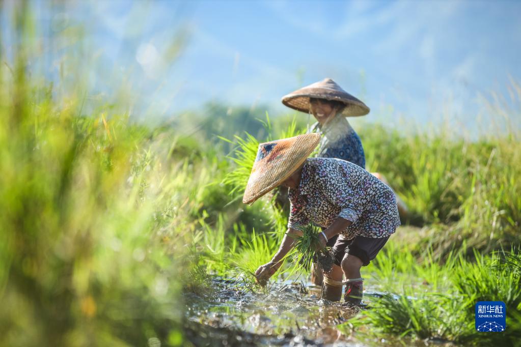 8月7日,湖南省永州市藍山縣塔峰鎮舜水村的農民在田間插秧。