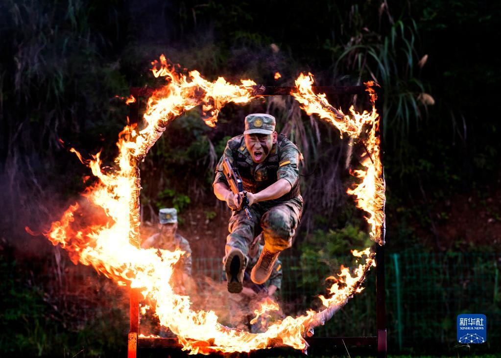 火箭軍某旅發射一營班長、一級軍士長何賢達在獵人意志訓練中穿越火障(2022年6月26日攝)。