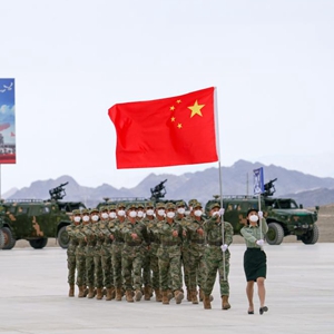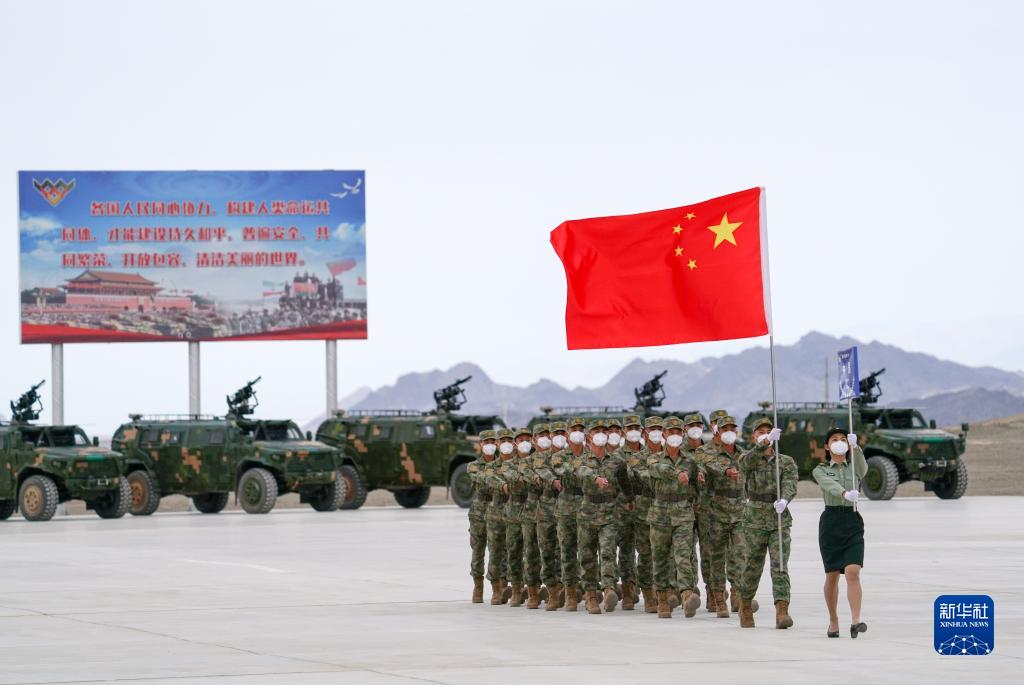 8月13日,“國(guó)際軍事比賽-2022”中國(guó)庫(kù)爾勒賽區(qū)比賽開(kāi)幕,中國(guó)參賽隊(duì)走過(guò)主席臺(tái)。新華社發(fā)(欒鋮 攝)