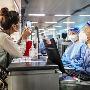 8月14日,海口美蘭機場的工作人員查驗旅客的核酸信息。
