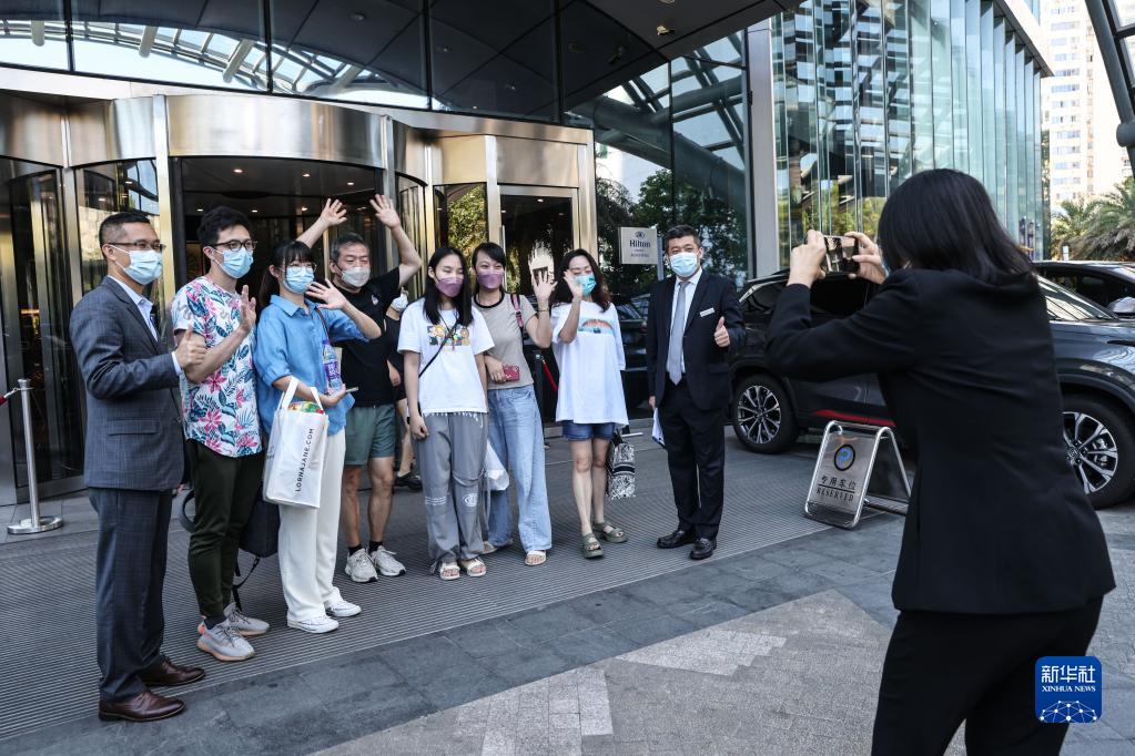 8月14日,準備返程的旅客在海口市龍華區(qū)一酒店門口與酒店工作人員合影。