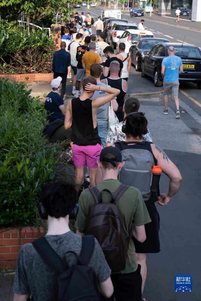 8月14日,人們在英國曼徹斯特一處猴痘疫苗接種點外排隊等待接種疫苗。