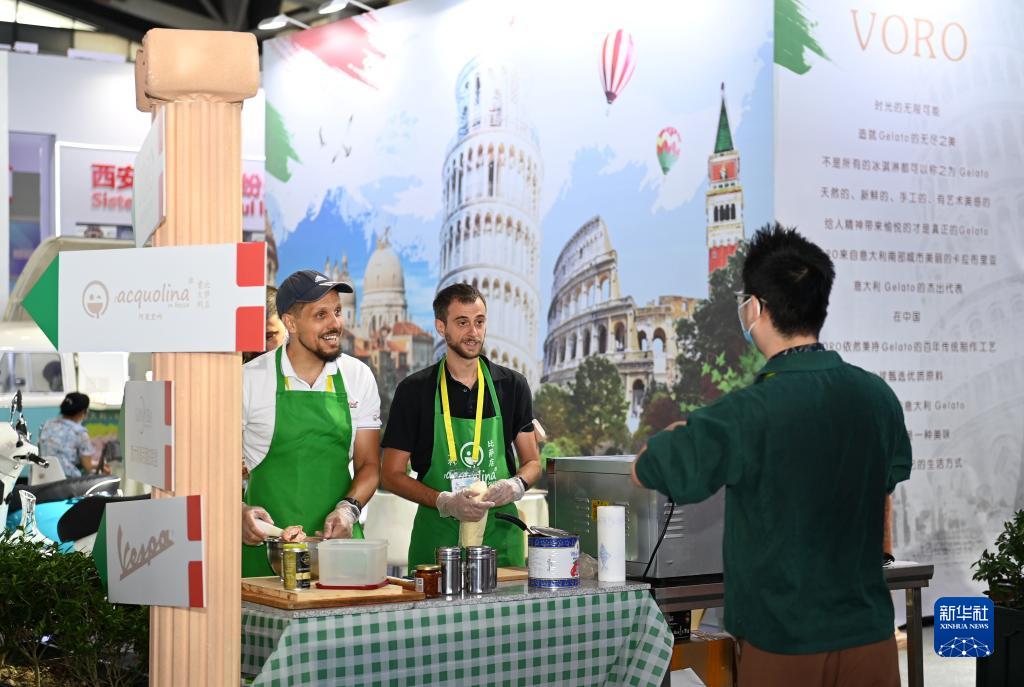 8月14日,參觀者在西安國際會展中心國際館意大利展區(qū)了解意大利美食。