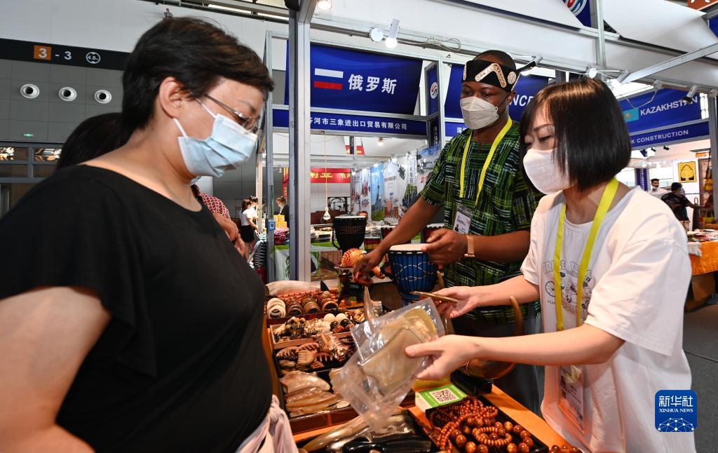 8月14日,參觀者在西安國際會展中心國際館加納展位上了解當?shù)靥厣a(chǎn)品。