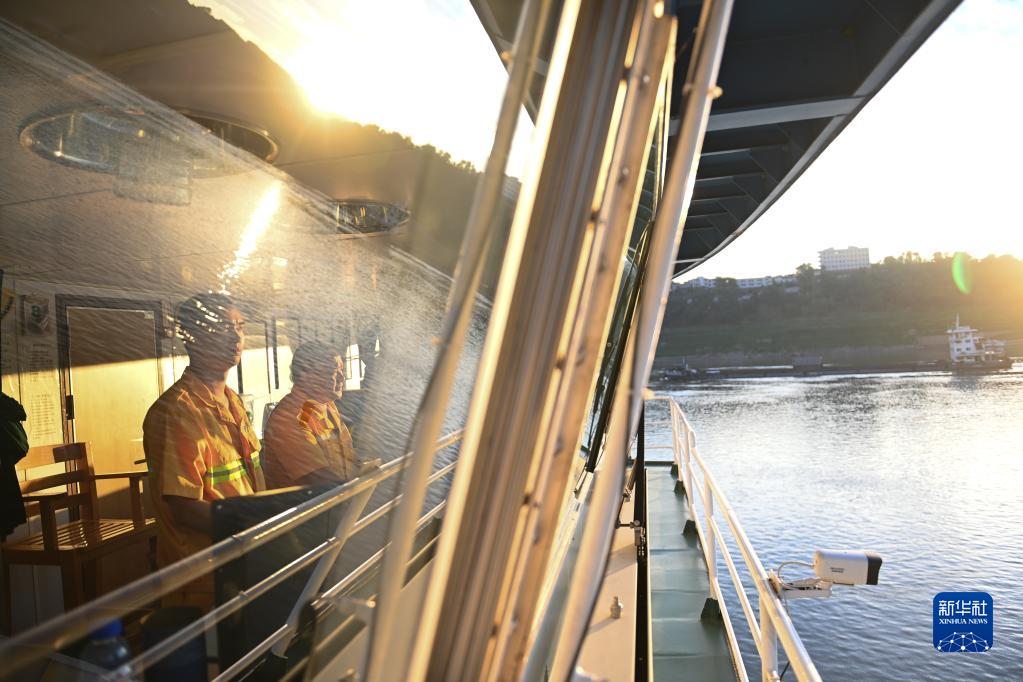 從后半夜四點開始值班駕駛的二副李行(左)和船長劉勇在民快輪駕駛艙迎來清晨的陽光(8月8日攝)。