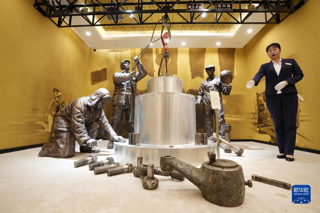 8月11日,在鏡泊湖發(fā)電廠的紅色主題展館內(nèi),講解員介紹1946年在中國(guó)共產(chǎn)黨領(lǐng)導(dǎo)下,工人修復(fù)發(fā)電廠的情況。
