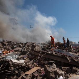 8月14日,救援人員在亞美尼亞首都埃里溫的購物中心爆炸現(xiàn)場工作。