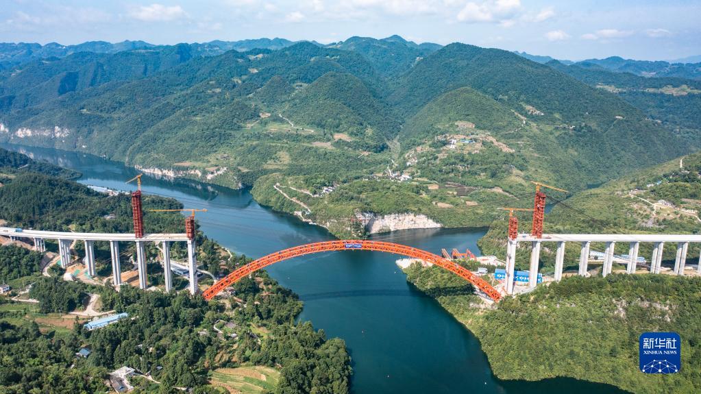 8月15日拍攝的德余高速烏江特大橋合龍現場(無人機照片)。