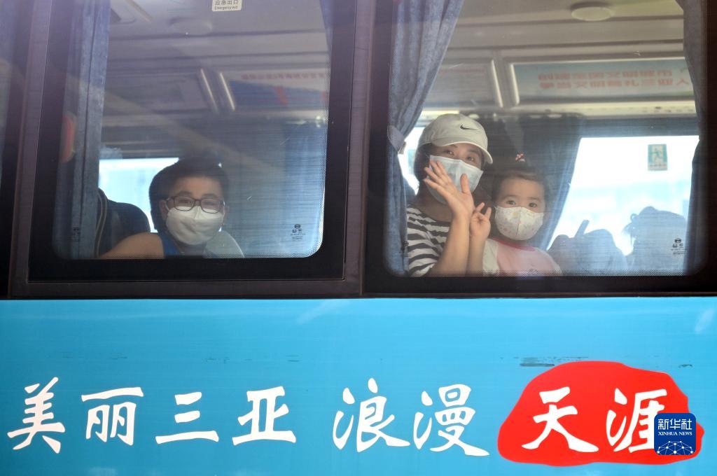 8月15日,游客在三亞一家酒店門前乘坐免費(fèi)大巴前往機(jī)場。