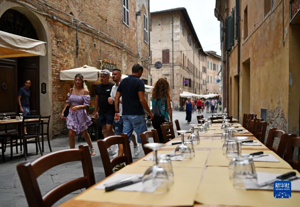 8月15日,游客們在意大利錫耶納街頭行走。