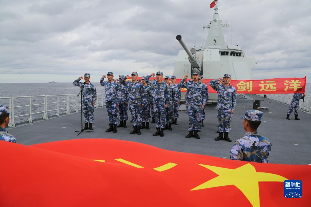 南昌艦為首次穿越島鏈的官兵舉行“英雄筑夢·礪劍遠(yuǎn)洋”大洋成人禮(2021年10月19日攝)。