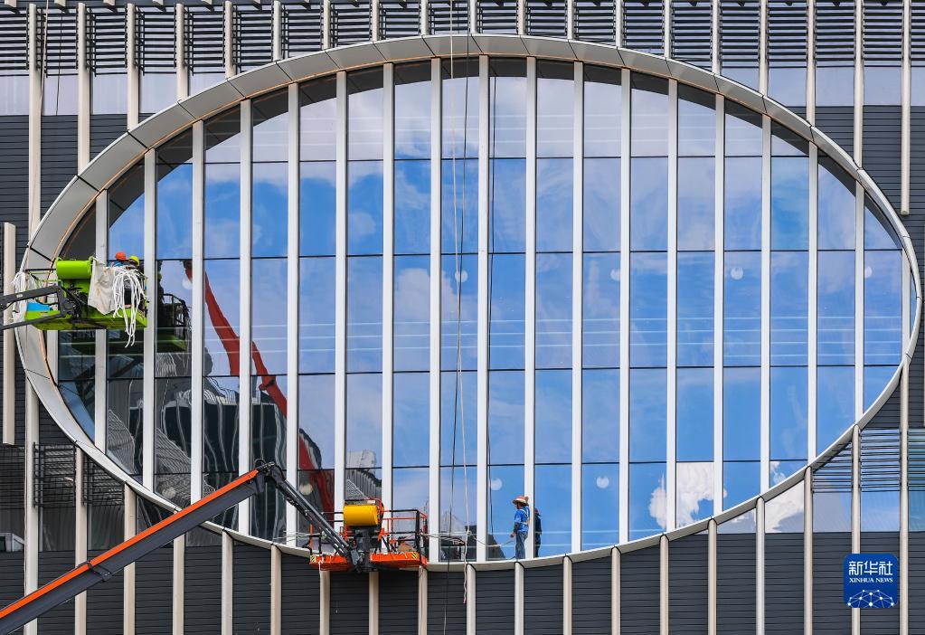 建設者在香港科技大學(廣州)圖書館清潔幕墻(8月16日攝)。