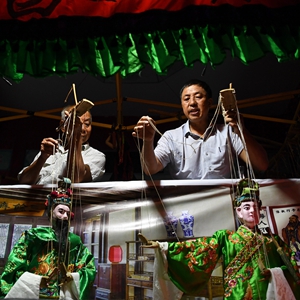 在江西省廣昌縣塘坊鎮大株村,木偶劇團團長謝幫銀(右)和同事一起表演木偶戲(8月10日攝)。
