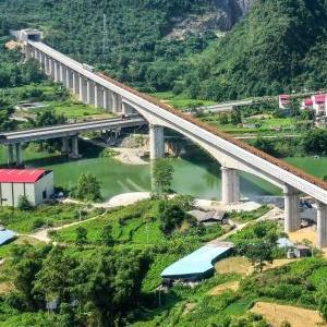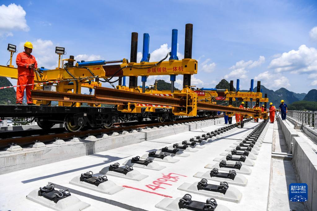 當日,在廣西河池市,一臺鋪軌機將一段500米長鋼軌鋪設在貴南高鐵龍江雙線特大橋的無砟道床上,標志著貴南高鐵正式進入鋪軌階段。建設中的貴南高鐵是我國“八縱八橫”高速鐵路主通道包頭至海口通道的重要組成部分,設計時速350公里。