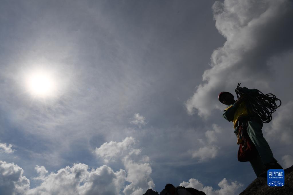 8月14日,李培生在黃山風(fēng)景區(qū)的懸崖峭壁間清撿完垃圾準備離開。