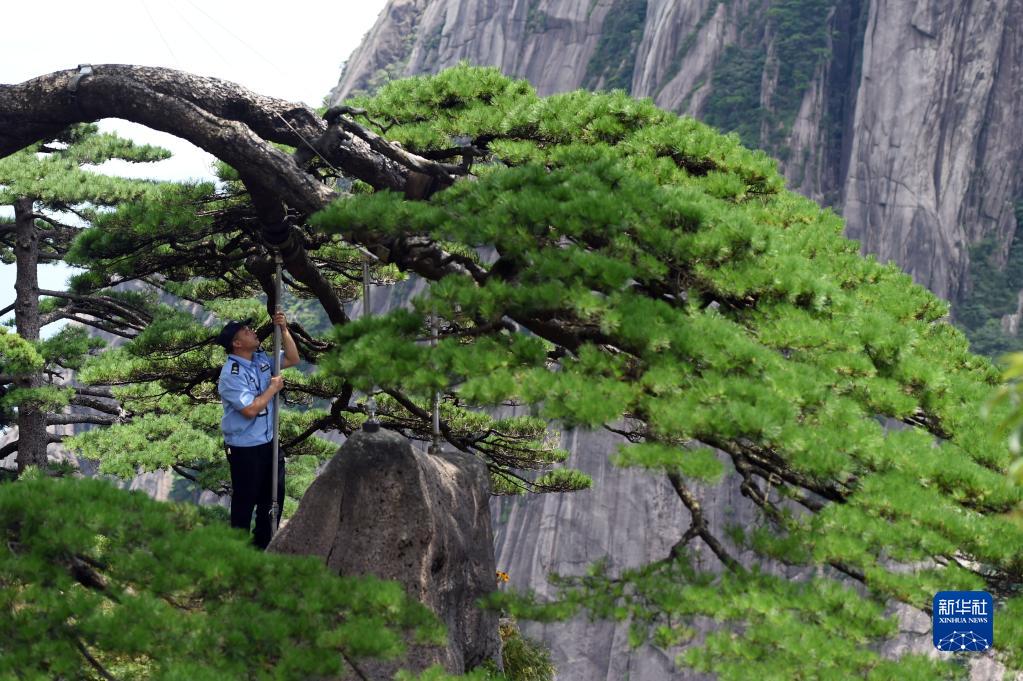 8月14日,胡曉春對迎客松的支撐桿進行檢查。
