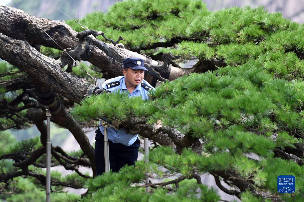 8月14日,胡曉春對迎客松的支撐桿進行檢查。