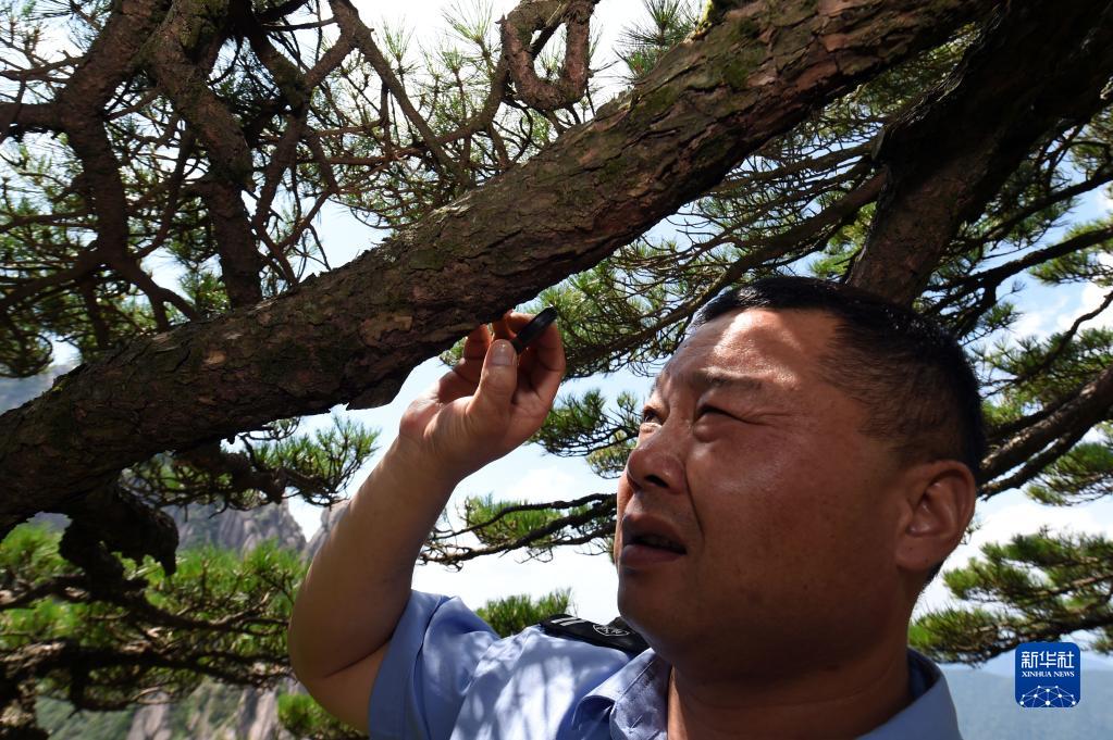 8月14日,胡曉春用放大鏡檢查迎客松的樹皮和紋理,以便及時發現病蟲害。