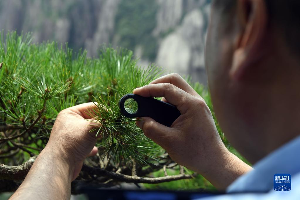 8月14日,胡曉春用放大鏡檢查迎客松的樹枝和松針,以便及時發(fā)現(xiàn)病蟲害。