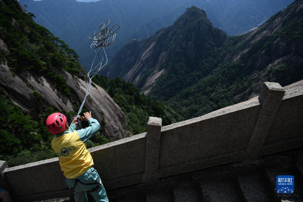 8月14日,李培生在黃山風(fēng)景區(qū)放繩準(zhǔn)備清撿垃圾。