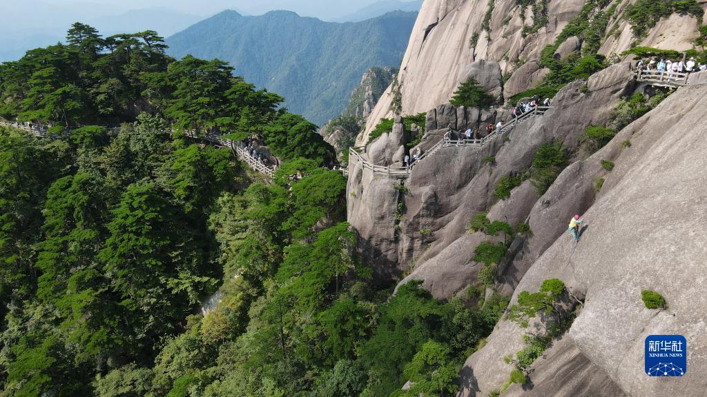 8月15日,李培生在黃山風景區的懸崖峭壁間清撿垃圾(無人機照片)。