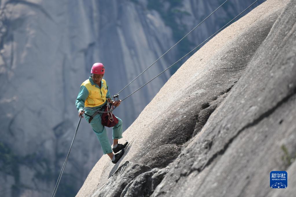 8月14日,李培生在黃山風景區的懸崖峭壁間清撿垃圾。