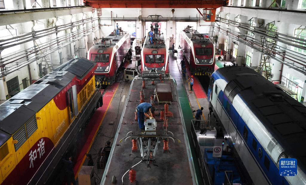 8月16日,廣州機務段職工在檢修機車車頂高壓設備。
