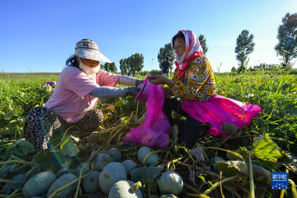 8月15日,種植戶將收獲的貝貝南瓜裝袋。
